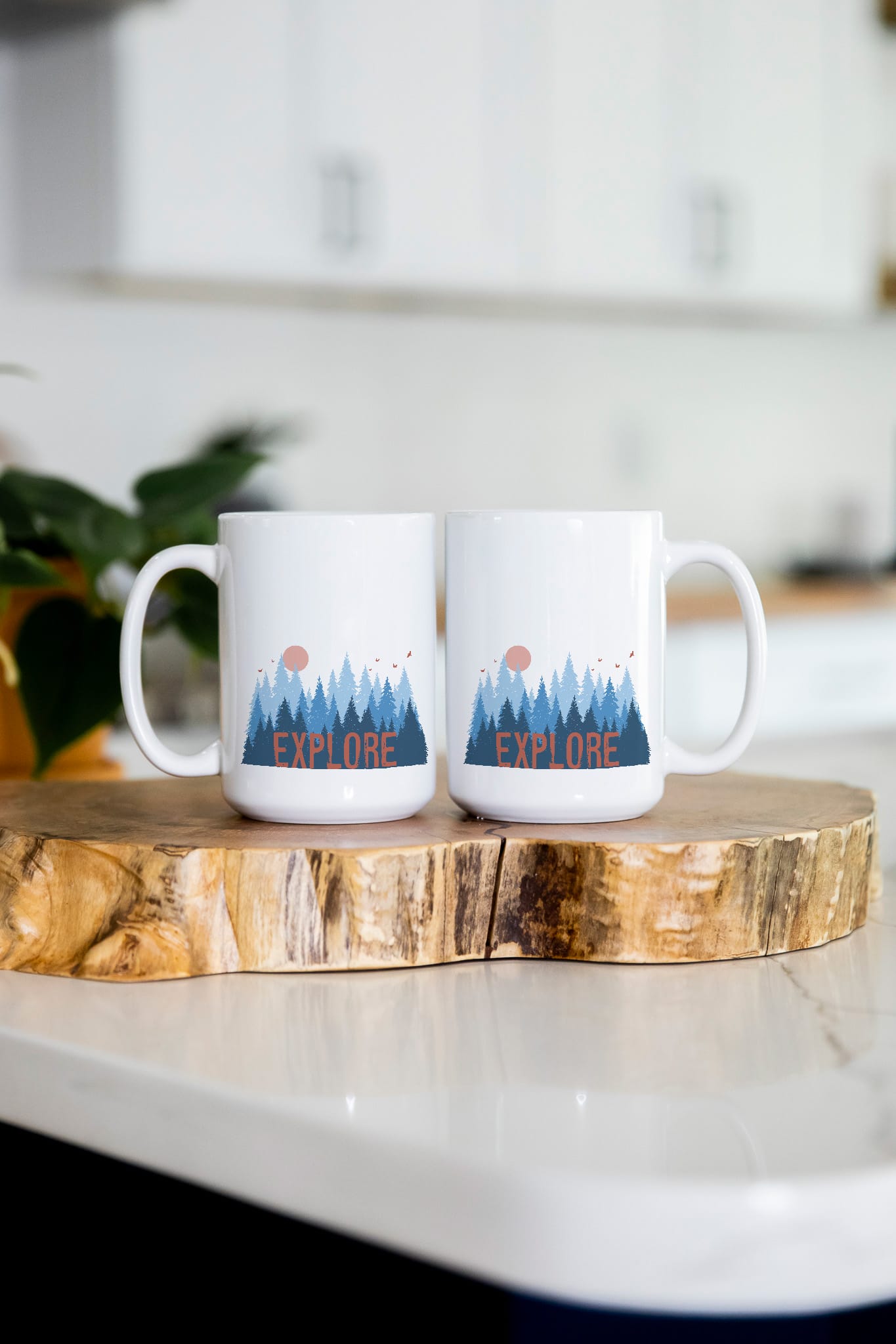 Maybe you have wanderlust too, if so then this travel mug is for you. This design features layers of trees in shades of blue with a coral colored sun in the background. A smattering of far off birds float above the trees and the word ‘Explore’ peeks out of the foreground pines.
