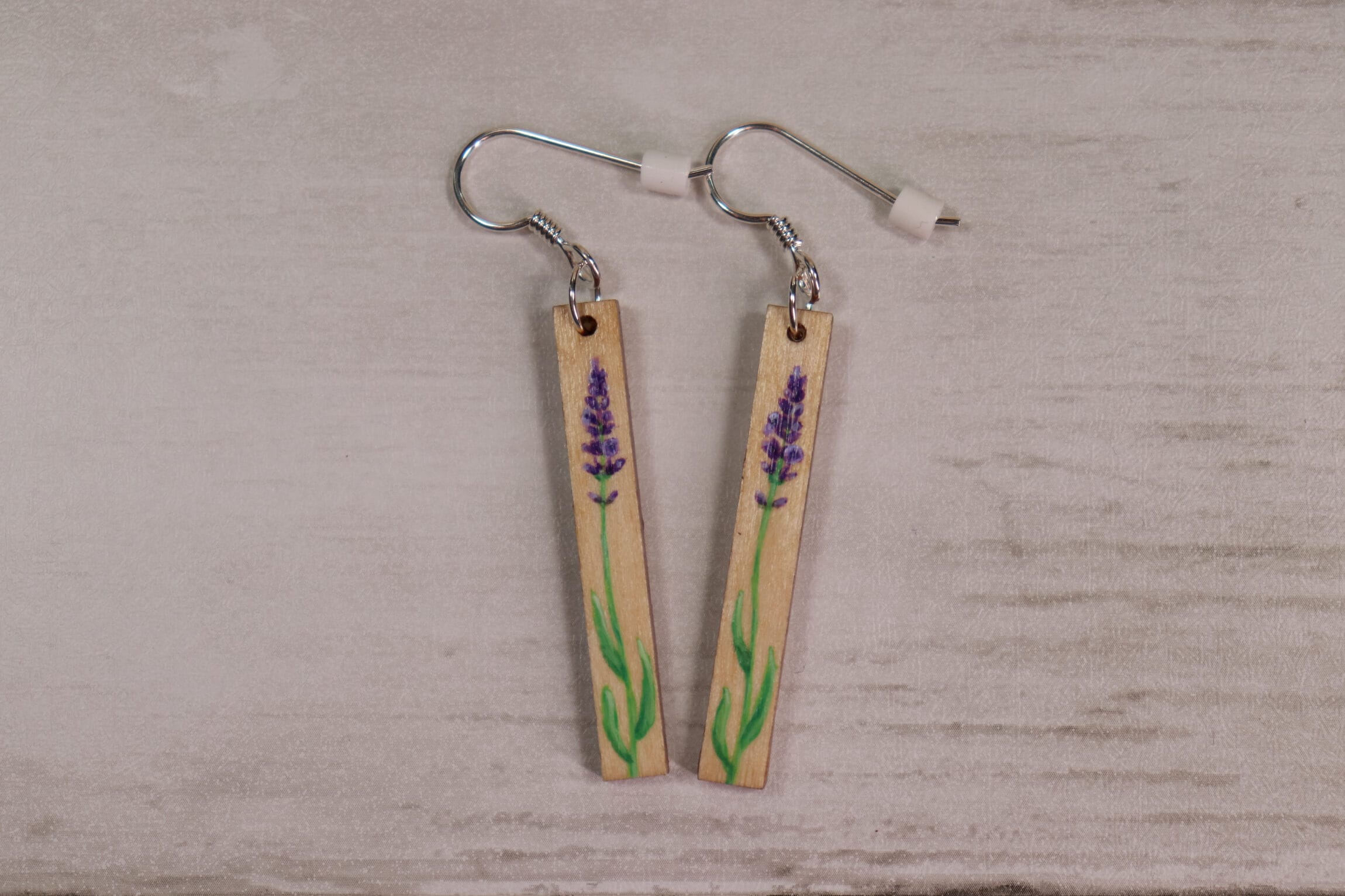 These earrings feature a stem of lavender in bloom with cool green leaves on a natural wood background.